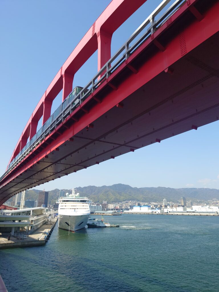 ポートアイランドへと向かう途中、神戸大橋からポートターミナル方面を撮影しました。ちょうど客船が入港するタイミングで、ポートターミナルの欄干から、大勢の方が歓迎していました。